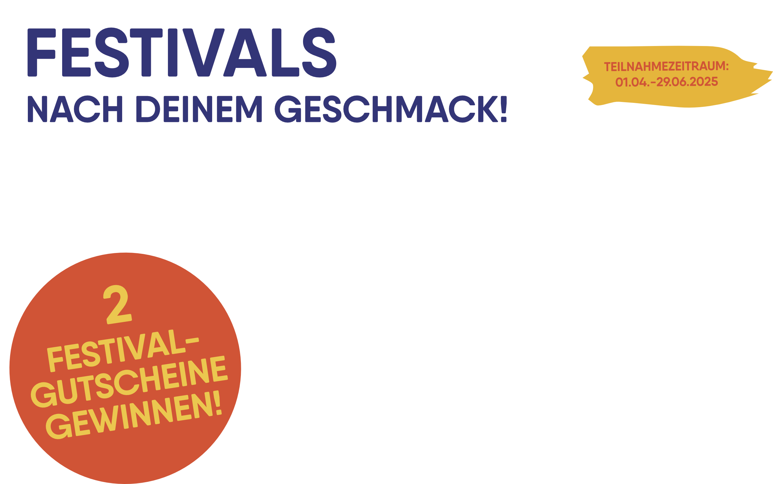 - Mit etwas Glück 2 Festivalgutscheine gewinnen (es werden 100 x 2 eventim Gutscheine im Wert von je 200 € pro Gutschein über den gesamten Teilnahmezeitraum verlost).